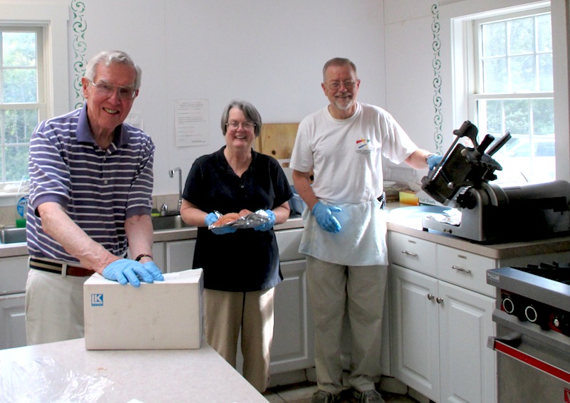 The Free Food For Kids program at the Church of the Holy Spirit is in full swing for the summer. Every weekday, healthy, sandwich-based meals are prepared in the CHS kitchen from 5:00 am to 8:00 am. The staff then puts the lunches, snacks, and breakfasts together as brown bag meals downstairs in the large classroom. The meals are delivered in coolers and served at four meal sites: two in Chatham, one in Truro, and one in Eastham.